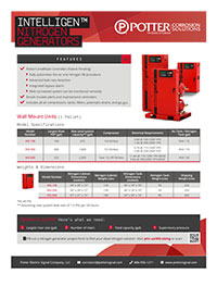 All systems are supplied as a fully assembled package ready to be connected to a new or existing fire sprinkler system. This turn-key system includes an integrated air compressor, nitrogen membrane, tank, all air filtration equipment, and the Potter IntelliGen® Controller.