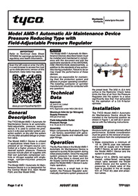 The TYCO Model AMD-1 Automatic Air Maintenance Device is an automatic, field-adjustable, pressure-reducing device. It is used to control the pressure in a dry-pipe sprinkler system, pre-action system, or dry-pilot line system of a dry-pilot-actuated deluge or pre-action valve.