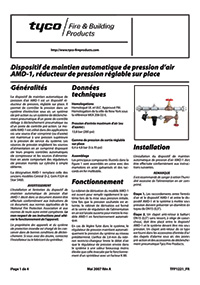 Le dispositif de maintien de pression d’air automatique TYCO modèle AMD-1 est un appareil automatique, réglable sur place, qui réduit la pression. Il sert à réguler la pression dans un système d’extinction automatique à eau sous pression, un système à préaction ou un système à ligne pilote sèche d’une vanne de déluge ou de préaction actionnée par pilote sec.