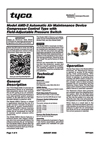 The TYCO Model AMD-2 Automatic Air Maintenance Device is an automatic, field-adjustable device that controls the on-off cycling of an air compressor. It is used to control the pressure in a dry-pipe sprinkler system, pre-action system, or dry-pilot line system of a dry-pilot-actuated deluge or pre-action valve.