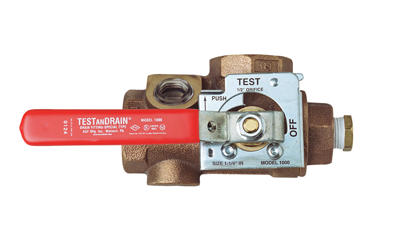 – 400 PSI rated single-handle ball valve designed to provide both the test function and the express drain function required by NFPA 25 for a wet fire sprinkler system.